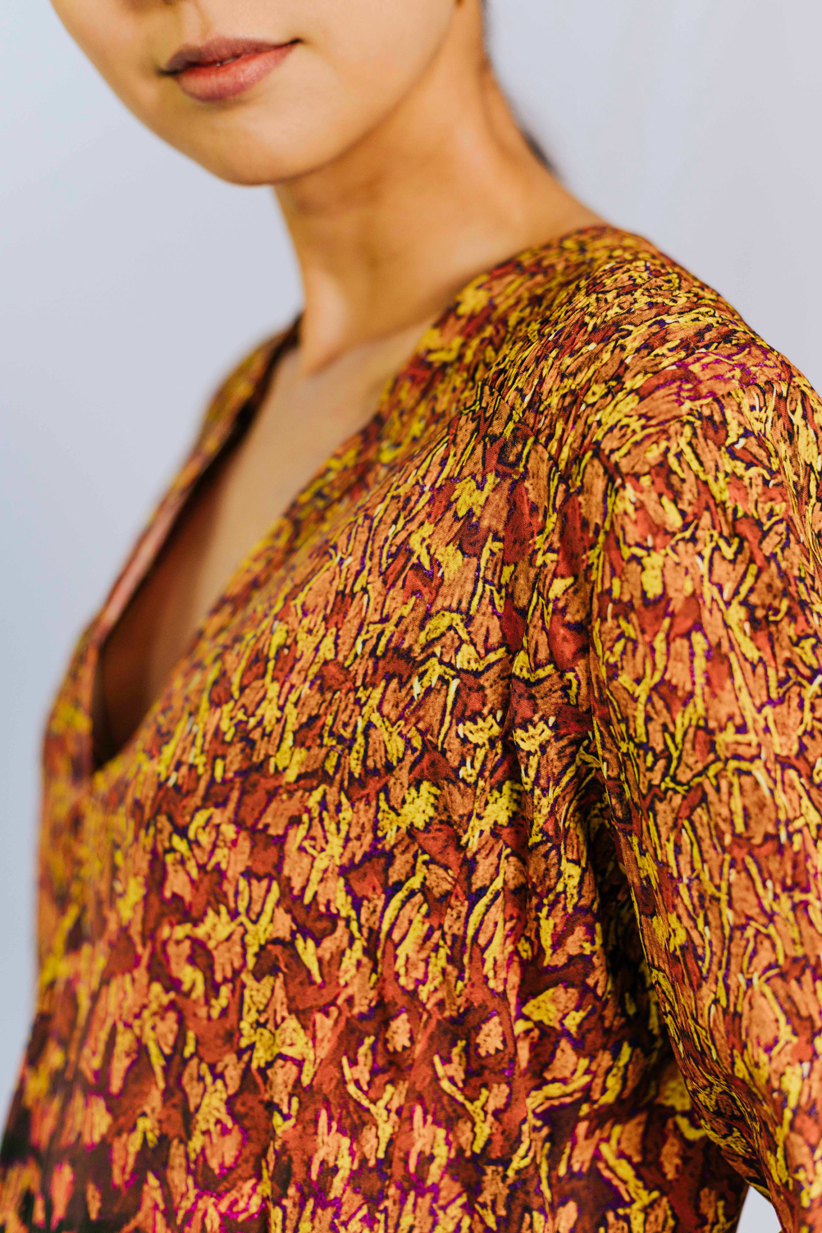 Printed on silk. Placed surface pattern.